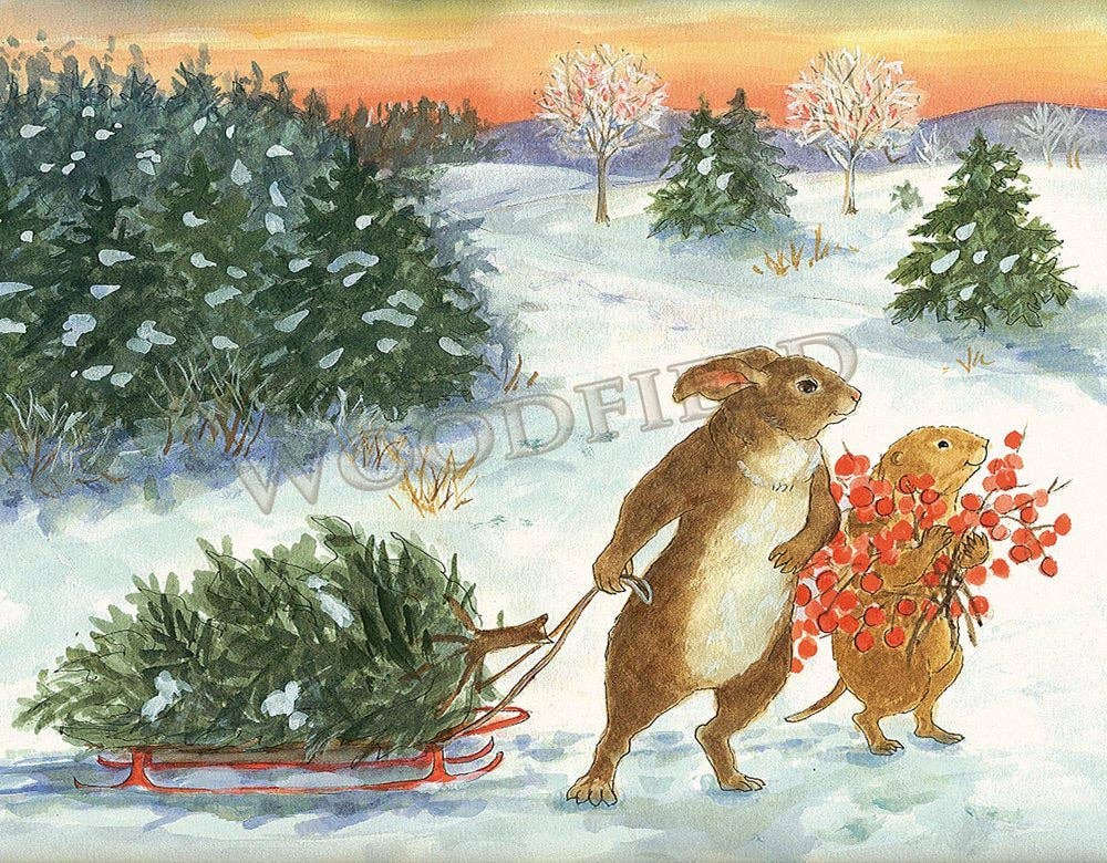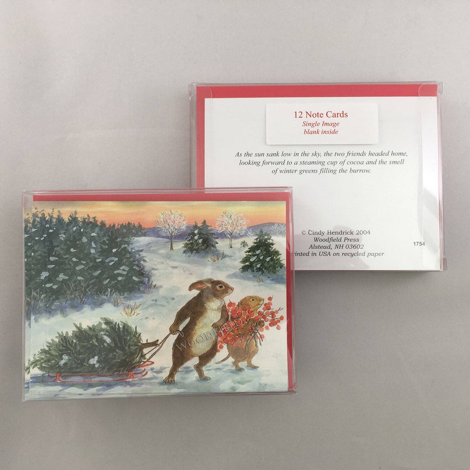 Read moreBoxed Set: Twelve 4-1/8" x 5-1/2" cards, each with the same image, printed on sturdy, heavyweight paper for stand-up display. Similar to design of the individual notecard except no border around the image. Packaged with 12 red envelopes in a clear box. Storyline on back. As the sun sank low in the sky, the two friends headed home, looking forward to a steaming cup of cocoa and the smell of winter greens filling the burrow.
