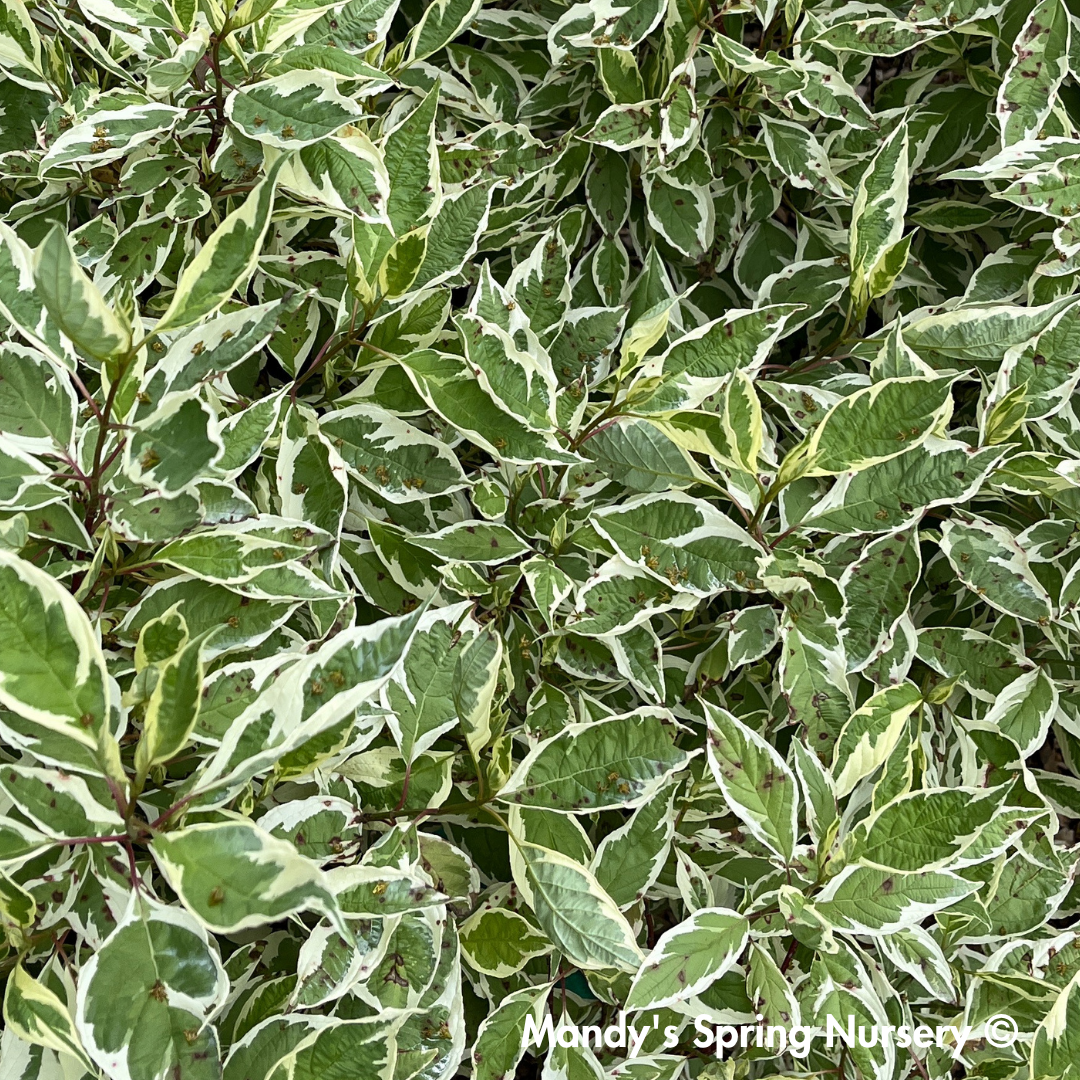 A Bailey Nurseries introduction, this compact selection of variegated dogwood provides beautiful variegated foliage in summer and attractive red twigs in winter.
