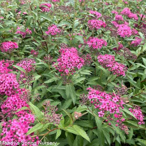 A newer Spiraea cultivar with a vigorous growth habit. Covered with bright cherry red flower clusters throughout the growing season. New growth has a tinge of purple before turning green.
