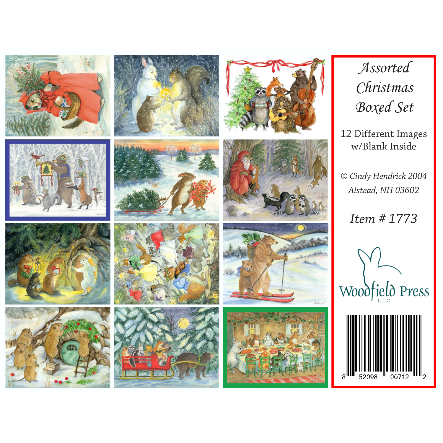 12 assorted Christmas season images with 12 red envelopes packaged in a clear box. The cards measure 4-1/8" x 5-1/2" and are printed on heavyweight paper for stand-up display.
