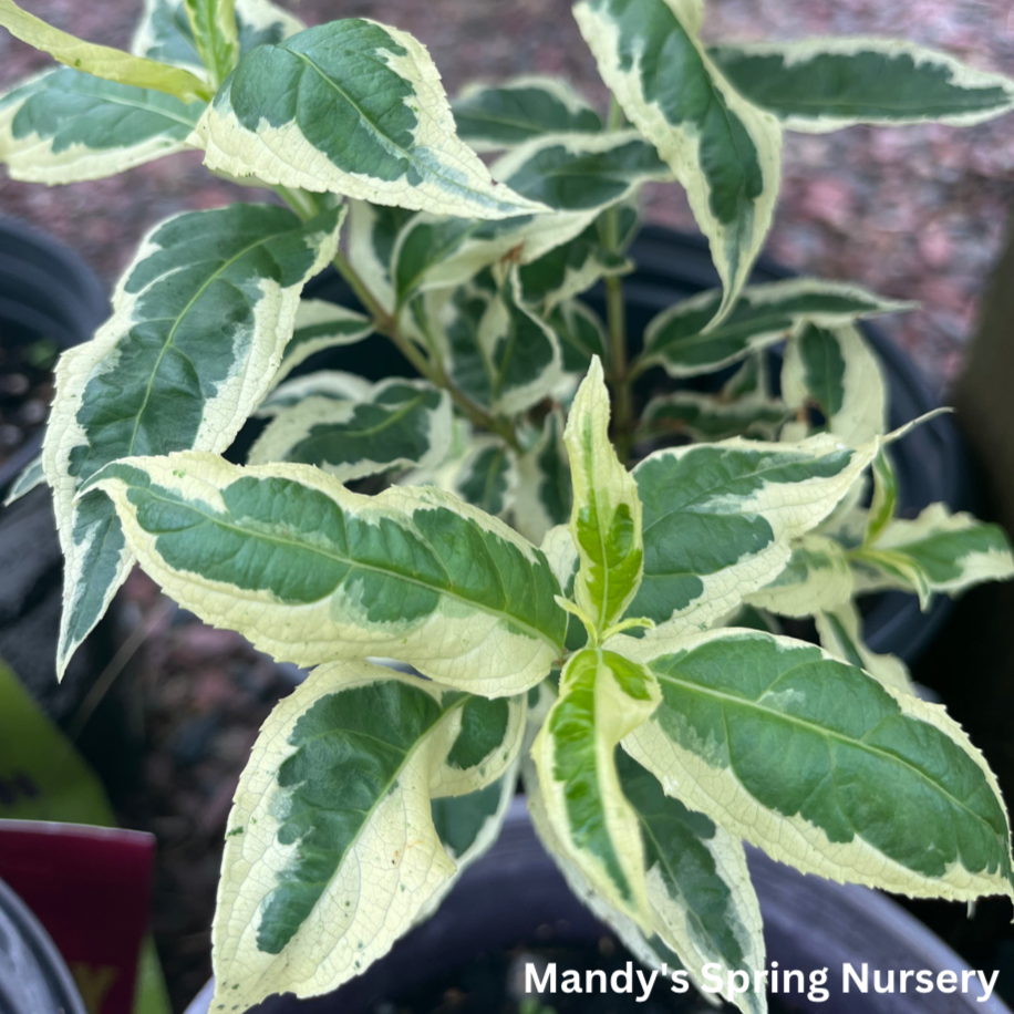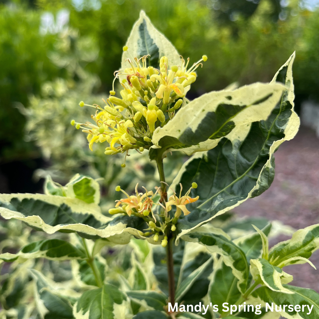 Read moreCool Splash®, the first variegated Diervilla, has bright white leaf margins that remain bright and clean until the first frost. Bunches of yellow blossoms adorn the plant in June and July. Easy to grow in a variety of soils as long as the soil is not bone dry. Cool Splash® is a densely branched shrub that forms underground suckers, developing colonies over time. Use in lightly shaded areas or mass plantings in full sun for a spectacular effect. Found by Peter Podaras.